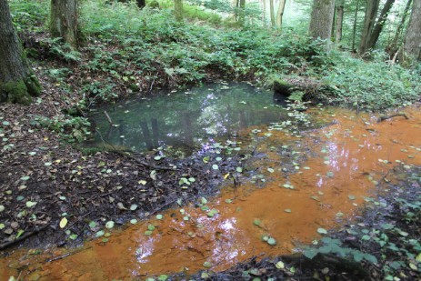 Der sinterhaltige Wasserfluss, dahinter vermutlich das Fundament eines kleinen Maschinenhauses