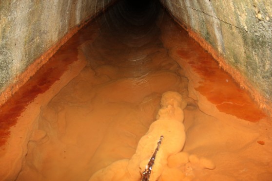 Setzt man ein anderes Lich auf das Wasser gerichtet ein, sind deutlich die Sinterablagerungen im Stollen zu erkennen.